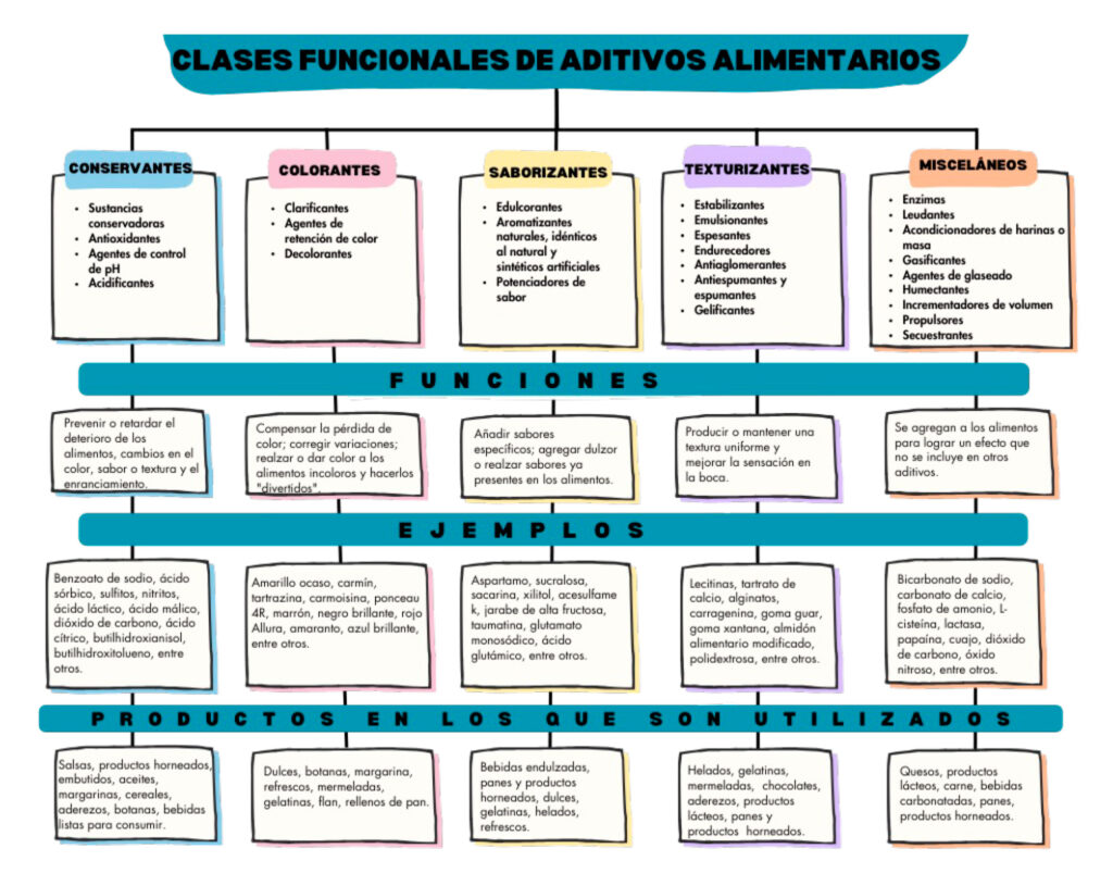 Para fines de este escrito, nos centraremos en los aditivos directos, los cuales pueden clasificarse según su función tecnológica, origen o propiedades. De acuerdo con su función, se agrupan en: conservantes, nutritivos, colorantes, saborizantes, texturizantes y misceláneos.4 Sin embargo, la clasificación puede variar dependiendo del país. Se presenta un resumen adaptado a los datos de México (Figura 1).