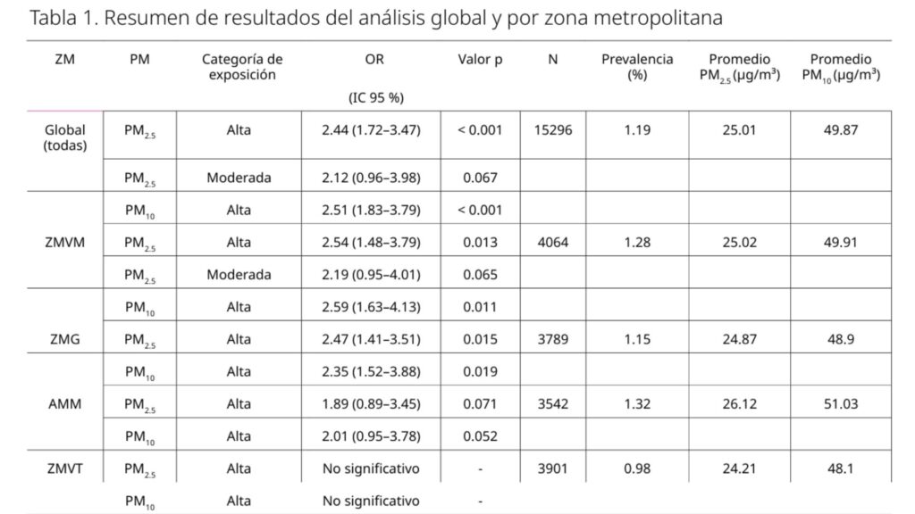 Los hallazgos del estudio ofrecen evidencia clara sobre la asociación entre altos niveles de material particulado en el aire y un mayor riesgo de EPOC. Por ejemplo, en la Ciudad de México y Guadalajara, la exposición alta a PM2.5 y PM10 duplicó o incluso triplicó el riesgo de padecer EPOC.